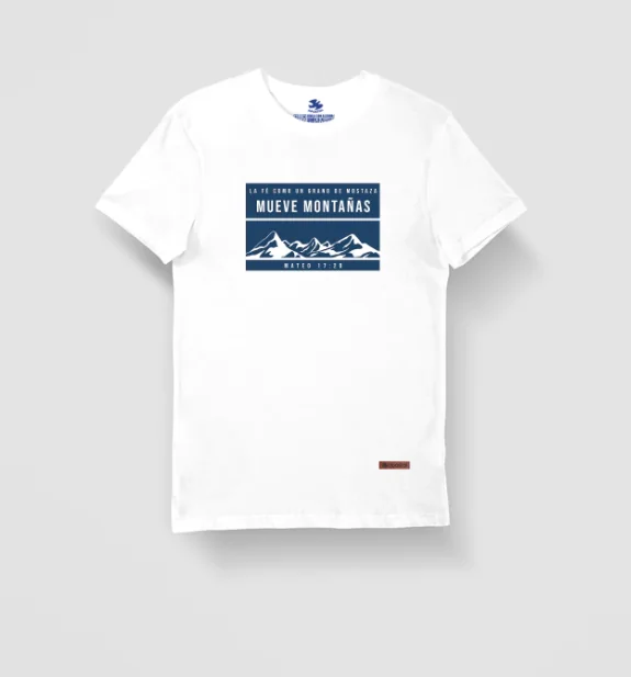 Remera Mueve Montaóas azul en algodón suave, con diseño espiritual y estampado duradero. Lleva fe y esperanza a diario. °Compra la tuya ahora!